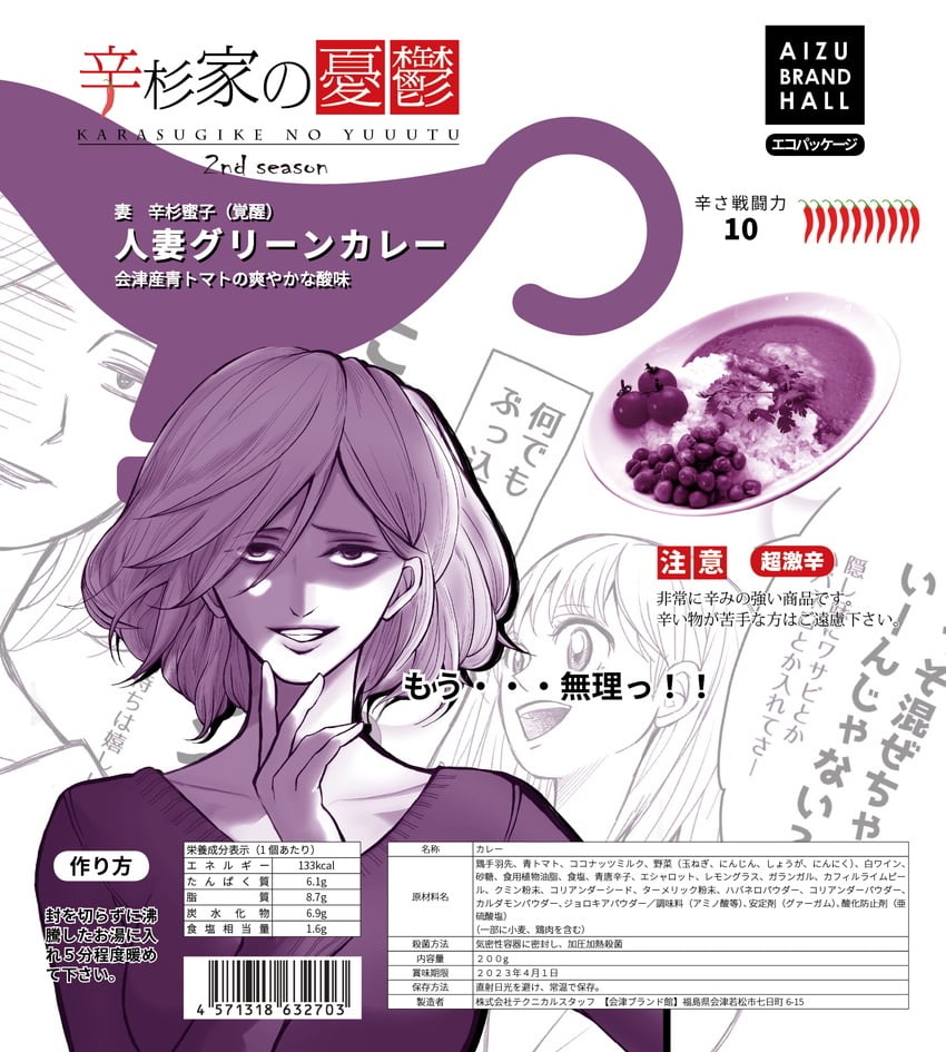 激辛専門ブランド「辛杉家の憂鬱」の2nd season。激辛ブームに乗ってコンビニやスーパーにも激辛商品は増えましたがそれほど辛くない物が多く、辛杉家は本当の「辛党」向けに作られた商品です。福島県会津産のブート・ジョロキアと平田村産ハバネロを使用しており非常に辛みが強いので苦手な方はご遠慮ください。妻「辛杉蜜子(覚醒)」手羽先が丸々1本入った食べごたえのある一皿。会津産の青トマトをたっぷりと使用し旨みと程よい酸味を添加。本場のグリーンカレーのようなココナッツミルクやパクチー感は若干抑えて日本人の口に合うように調整しました。1st seasonの天罰カレー(辛さ戦闘力30)次ぐ辛さ!!『もう・・・無理っ!!』