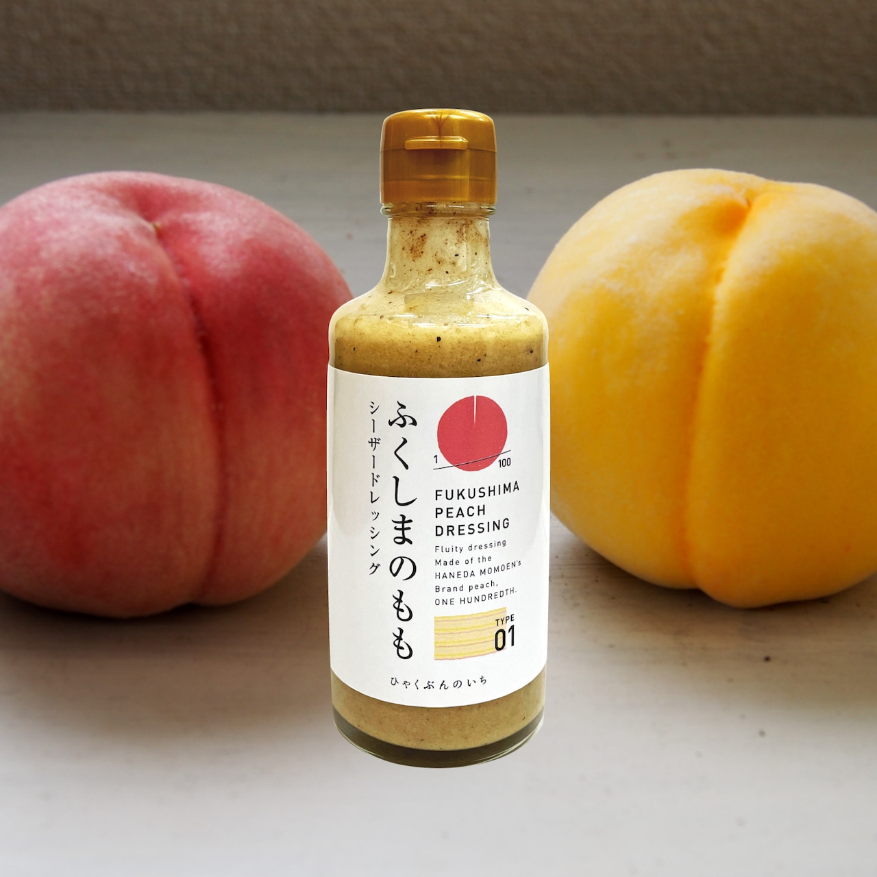 皇室献上桃の産地として知られる福島県桑折町。ブランド「ひゃくぶんのいち」は、羽根田桃園が育てた桃を活かした商品開発を行っております。 ももシーザードレッシングは、ももの甘みとチーズ・アンチョビ・のコク、さらにカルピスがアクセントになり 野菜を美味しく食べることができるドレッシングとなっております。 甘いの?と思われた方も多いと思います。この商品は穀物酢とのバランス配合により甘すぎずくど過ぎない桃の風味を味わっていただける商品となっております。