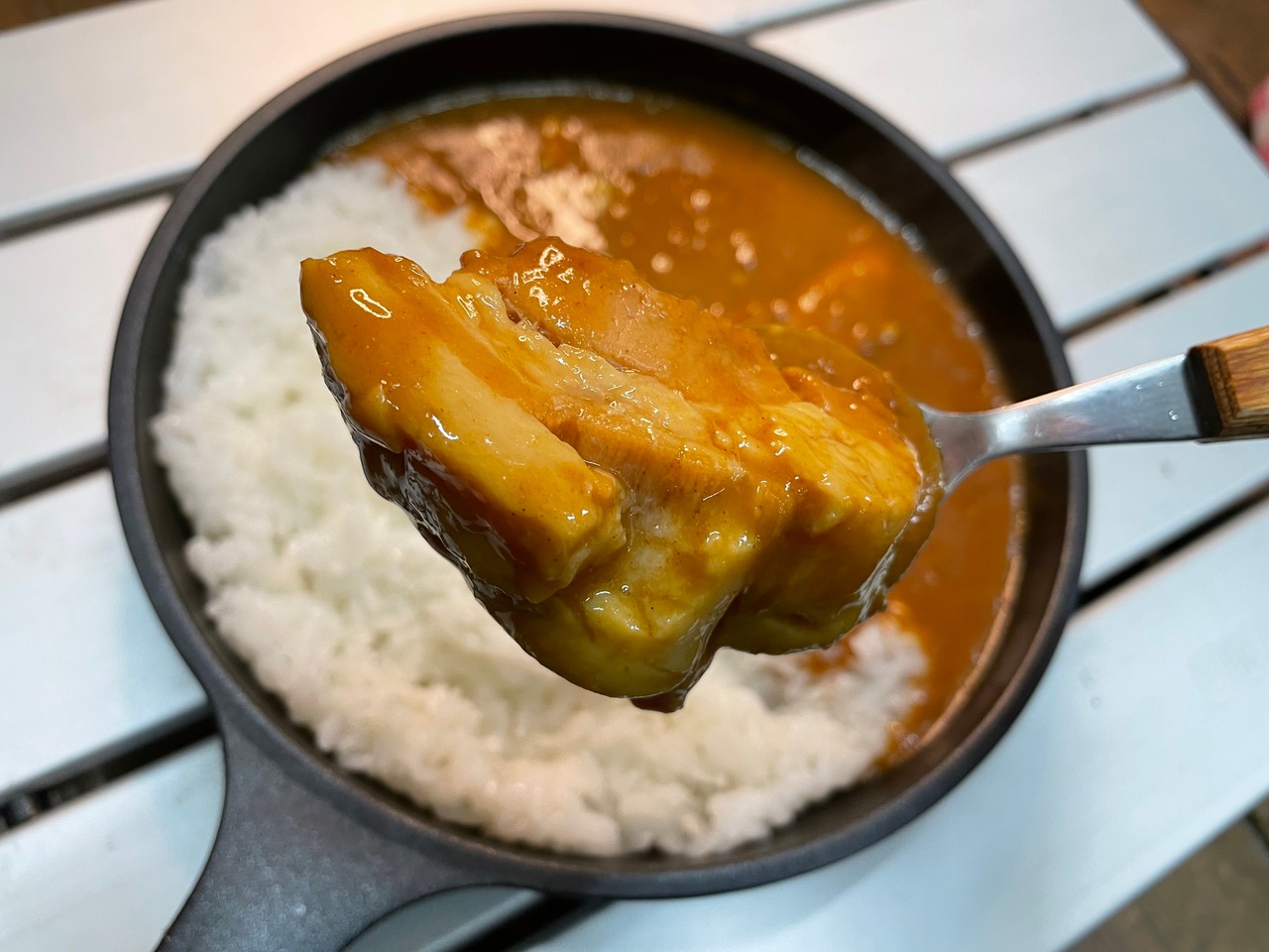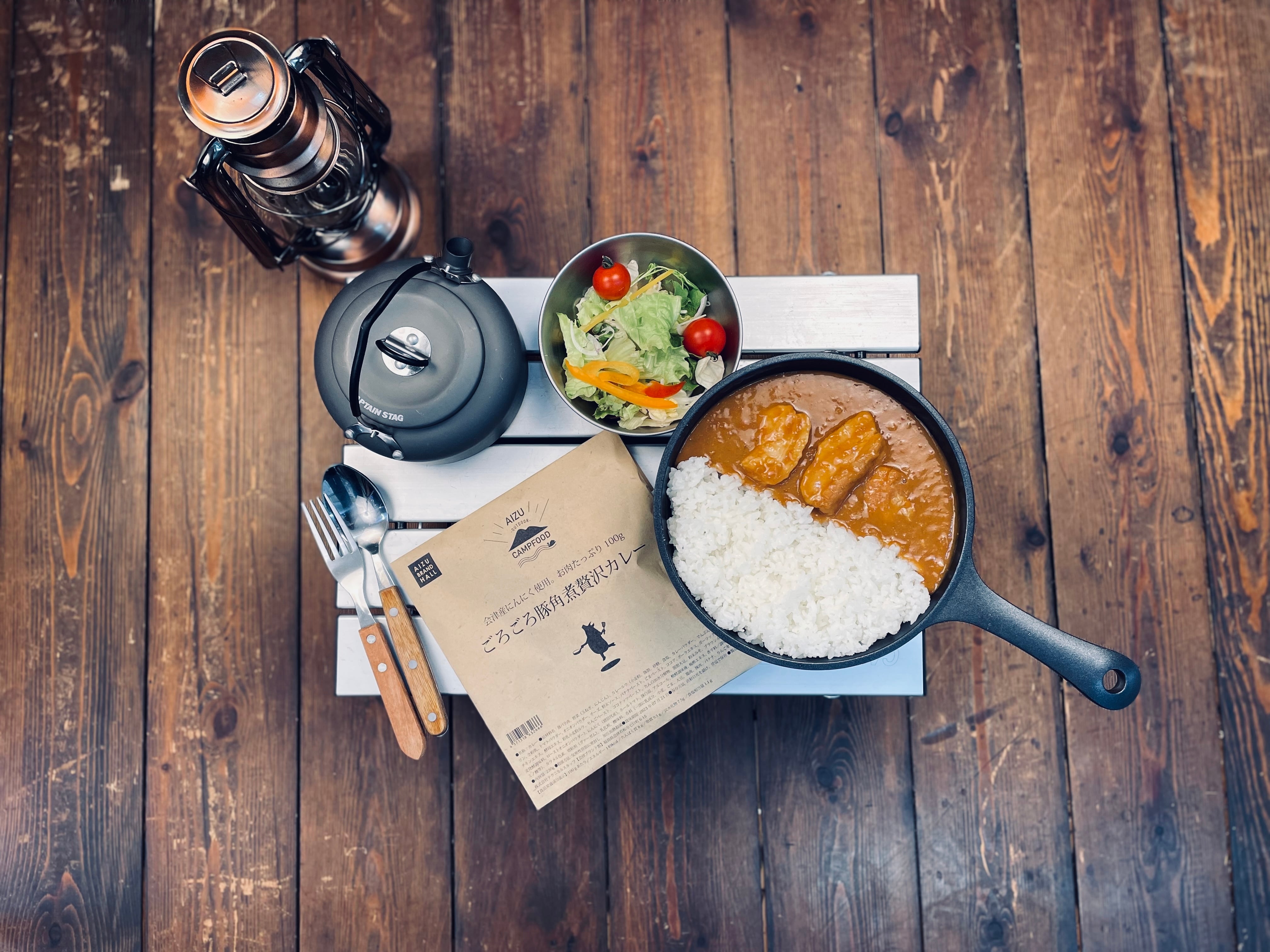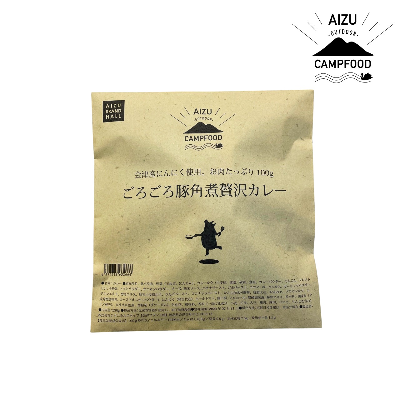 会津のキャンプシーンを彩る「AIZU CAMPFOOD」シリーズ。地元食材を積極的に活用した美味しいキャンプ飯をエコパッケージでお届け。ゴミの低減にも。 会津産にんにくと100gを超えるBIGな豚角煮が入ったパンチ力抜群のカレー。カレーと共に煮込まれた角煮は柔らかくジューシー。がっつり肉をワイルドに食べたい方にお勧めです。