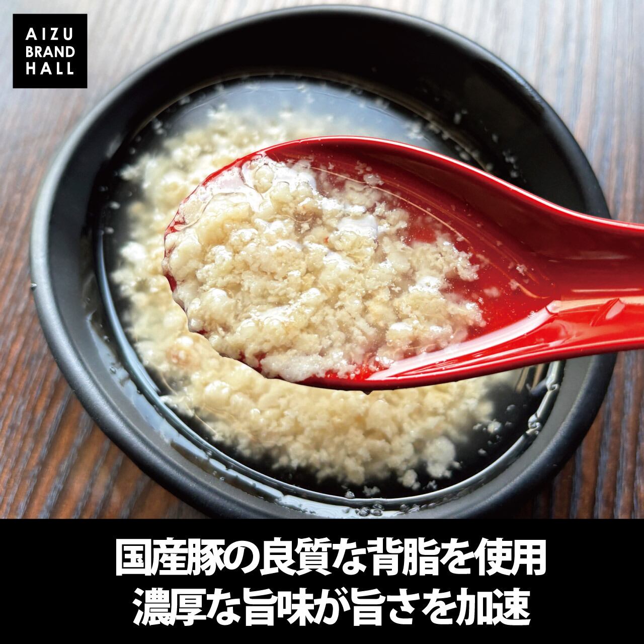 あっさり系が主流の喜多方ラーメンの中で、近年人気を集めているのが背脂醤油ラーメンです。創業100年の星醸造のキレのある醤油に、国産豚背脂の甘みと旨味、コクを重ねました。豚骨・鶏ガラ・丸鶏をベースに炊き上げたスープは、少量では成立しない味のバランスを保つため、あえて大容量で仕上げています。多加水中太ちぢれ麺に合わせ、科学的に抽出された濃縮エキスには頼らず、本物の素材だけで作った背脂スープです。24時間いつでも、行列に並ぶことなく、女性やファミリーでも無理なく楽しめる本格喜多方ラーメンをご家庭でお楽しみいただけます。本格ラーメンを、もっと自由に。会津ブランド館。