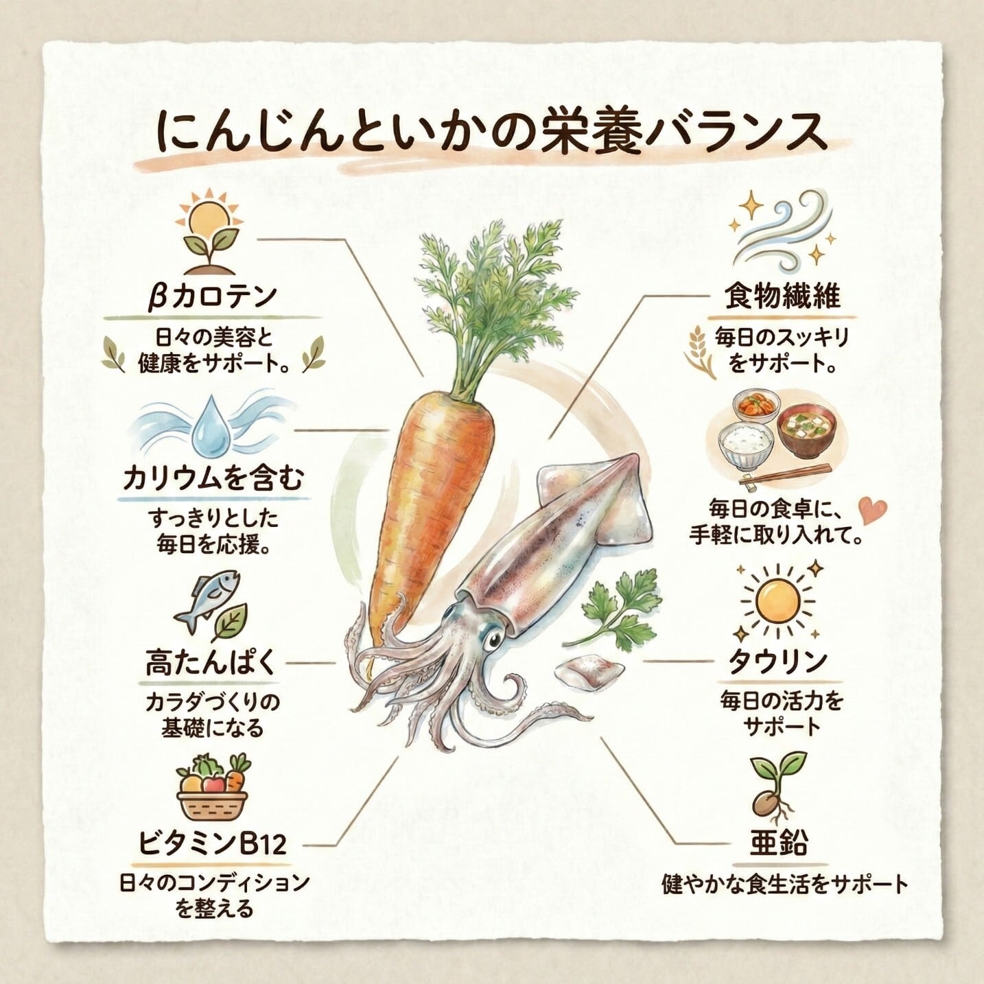 ✅ 噛むほどに広がるいかの旨みと、にんじんの自然な甘さが特長