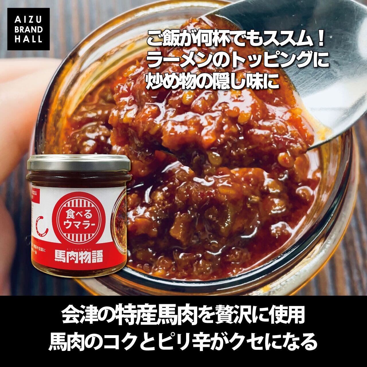 会津産の馬肉を使ったご飯のお供2種類セット。ウマラーは四川の本格的な香辛料を使用したピリ辛の味付けでご飯だけではなく炒飯や餃子などの中華にもご利用ください。ウマ味噌は大葉の爽やかな香りに加えオメガ3脂肪酸豊富なじゅうねん(えごま)を追加。プチプチの食感もお楽しみ頂けます。会津の馬肉は明治時代、戊辰戦争で傷ついた方々の体力の早期回復のために食されたことが始まり。たんぱく質が多く高い栄養価なのに低カロリーの会津の馬肉を是非お楽しみください。