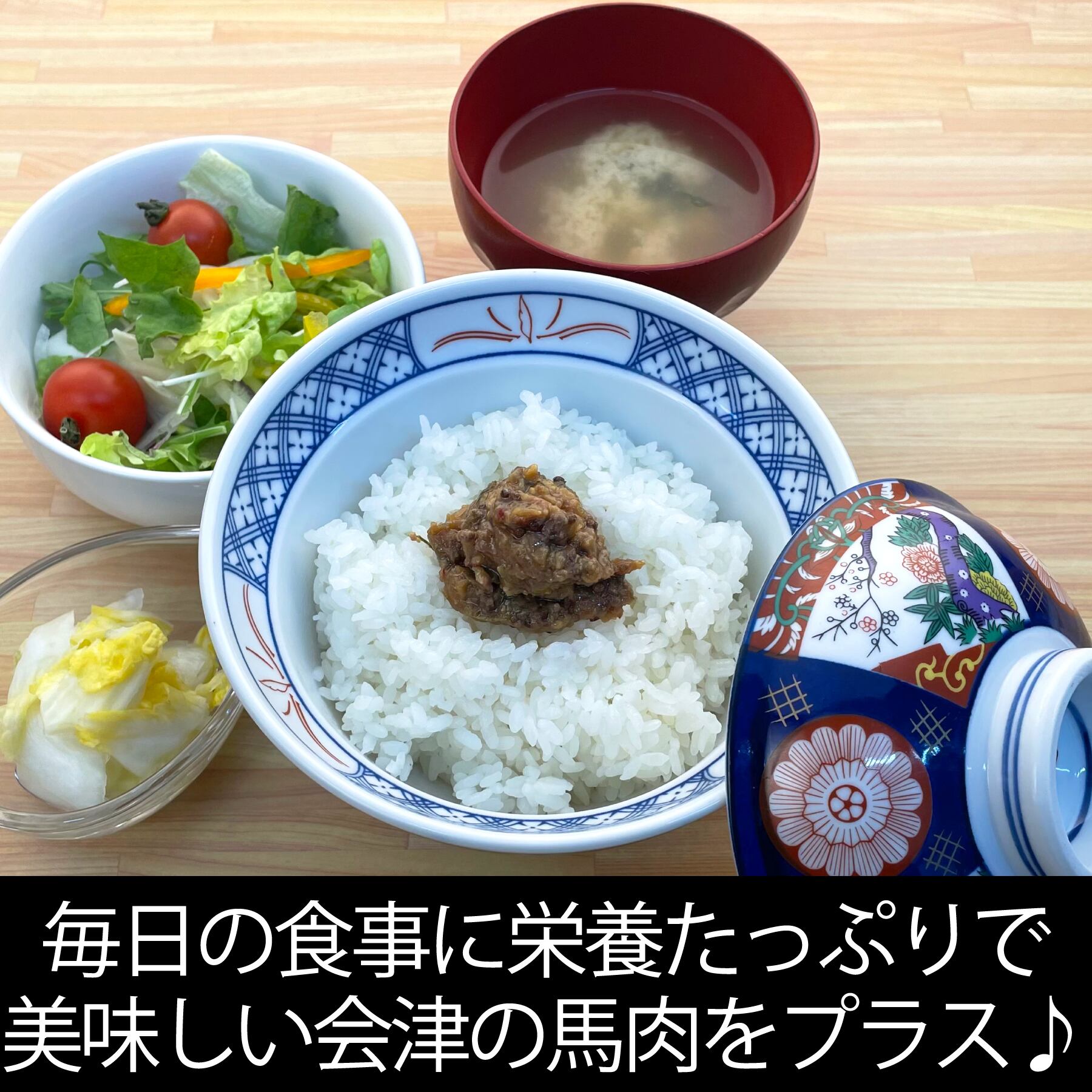 会津ブランドの馬肉を使った食べるウマ味噌。馬肉は高たんぱく低カロリーでビタミンも豊富。ヘルシーで美味しいウマ丼ぶりをお楽しみください。会津の馬肉は明治時代、戊辰戦争で傷ついた方々の体力の早期回復のために食されたことが始まり。馬肉はたんぱく質が多く高い栄養価なのに低カロリー。ビタミンB群や鉄分も豊富で体内の代謝を促し貧血予防にも効果的!馬肉といえば「馬刺し」が定番ですが、こんなに素晴らしいお肉を馬刺しだけで食べるなんてもったいない!「馬肉物語」は新しい食の提案です。