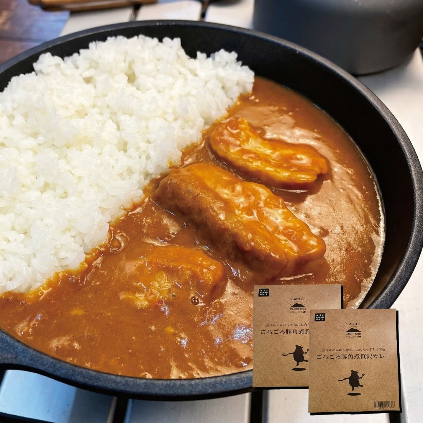 会津のキャンプシーンを彩る「AIZU CAMPFOOD」シリーズ。地元食材を積極的に活用した美味しいキャンプ飯をエコパッケージでお届け。ゴミの低減にも。 会津産にんにくと100gを超えるBIGな豚角煮が入ったパンチ力抜群のカレー。カレーと共に煮込まれた角煮は柔らかくジューシー。がっつり肉をワイルドに食べたい方にお勧めです。